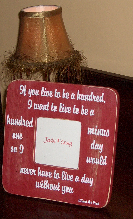 These frames come in the color of your choice and are 8" x 8". The opening for the picture is 3 1/2" x 3 1/2". Perfect as a wedding gift, shower gift or birthday present. You can choose the wonderful phrase from Winnie the Pooh, or design your own! |